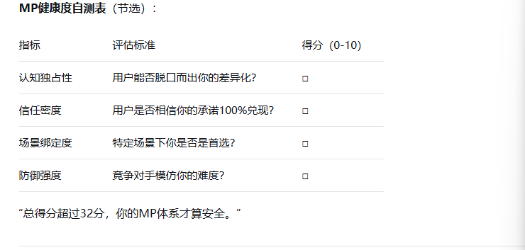 正在欧美成熟市场,用户因“数据迁徙成本”放弃竞品)。并了《哈佛贸易评论》读者专属的“MP健康度自测表”(节选):